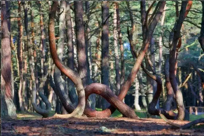 Что заставило эти сосны так немыслимо изогнуться? Единственная правдоподобная версия - сочетание зыбкой песчаной почвы и ветра.