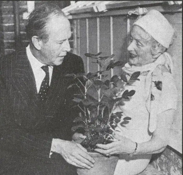 Мюриэл Ховарт показывает английскому писателю Беверли Николсу растение, выращенное из облученных арахисовых семян. Источник изображения: wikimedia.org