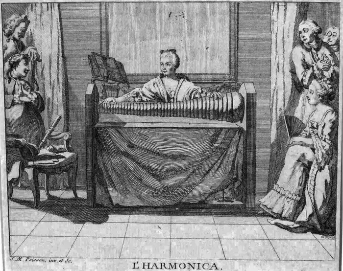 В 1761 году американский учёный и изобретатель Бенджамин Франклин (тот самый, портрет которого можно увидеть на банкноте в 100 долларов США) изготовил 37 больших стеклянных бокалов-колокольчиков, каждый из которых издавал свою собственную ноту. Затем он аккуратно просверлил в этих бокалах отверстия и усадил бокалы на общую ось; ось приводилась во вращение механизмом с качающейся педалью (как старинная швейная машинка).