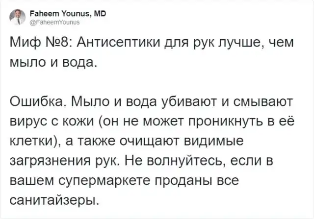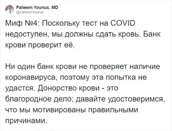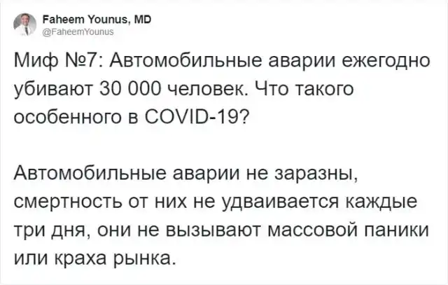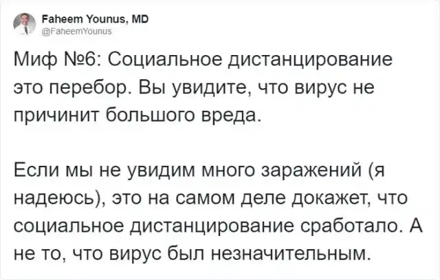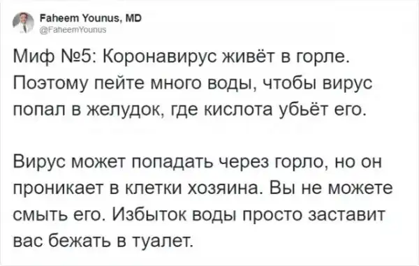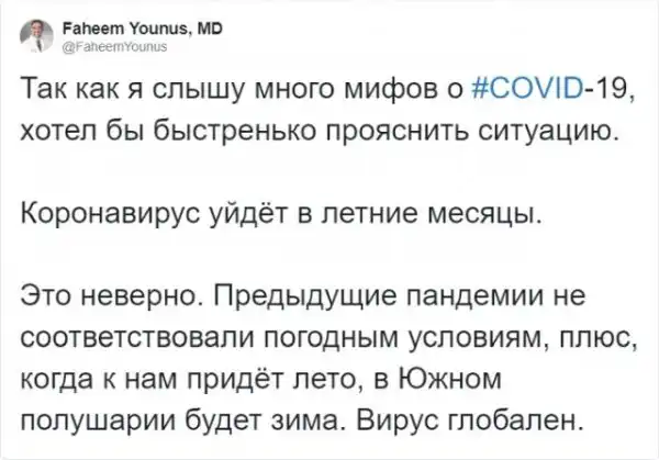 Можно смело заявить, что коронавирус опасен не только для физического здоровья, но и для душевного. Из-за страха перед пандемией, в Сети плодится множество слухов и мифов о COVID-19. А фейковые новости о болезни могут быть опаснее, чем сам китайский вирус. Например, существует популярное мнение, что коронавирус - это глобальный заговор. Чтобы пресечь распространение подобных глупостей, сотрудник университета Мэриленда Фахим Юнус и специалист по инфекционным заболеваниям создал в Твиттере специальный тред, в котором развеял самые распространенные мифы о коронавирусе.