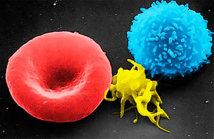 Слева направо: эритроцит, тромбоцит и лейкоцит