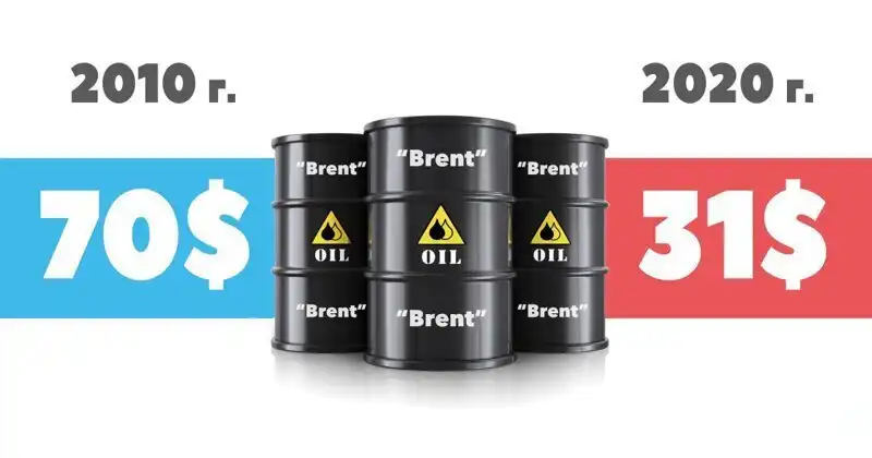 На примере нефти марки "Brent": в 2010 году баррель стоил - 70$, сегодня стоимость упала до 31$.