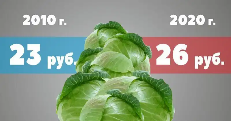 1 кг капусты можно было взять в 2010 году за - 20 рублей, сегодня в ближайшей "Пятерочке" или "Магните" цена около 26 рублей за кг.