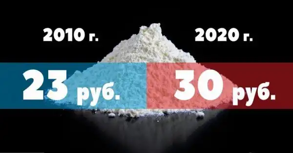 Один кг муки высшего сорта в 2010 стоил - 23 рубля, сегодня средняя цена по России составляет - 30 рублей.