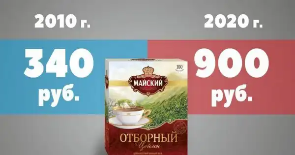 "Майский" за упаковку в 200 грамм в 2010 - 68 рублей ( в "Ашане"), сегодня та же самая упаковка стоит около 180 рублей. Таким образом кг чая в 2010 году - 340 рублей, а в 2020 - 900 рублей.