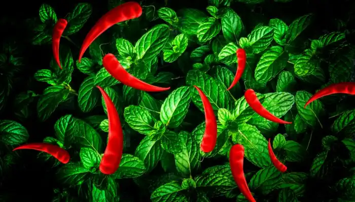 Жар от острогоПо аналогии с мятой, при употреблении острого, мы можем чувствовать жар из-за капсаицина, входящего в состав чили. Его малая концентрация дает тепло, а высокая соответственно – жгучую боль. Этот эффект используется при приготовлении острых блюд, его также используют в фармакологии – это те самые прогревающие крема. Пища, обжигающая язык – именно так можно охарактеризовать жгучий перец.