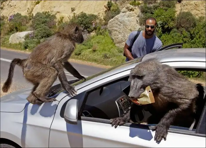 Бабуины грабят машину туриста в Центральной Африке.