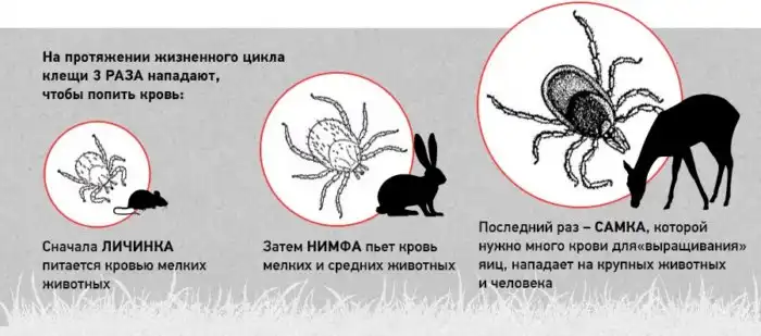 Первая стадия — личинка. Малыш размером в 0,5 миллиметров сразу же ищет свою первую жертву. Человек клещу пока не интересен, под удар паразита попадёт какой-нибудь мелкий зверек, вроде лягушки или полёвки. Отсосав необходимую дозу лейкоцитовой «Растишки», юный кровосос готов к перерождению. На второй стадии, когда клещ превращается в нимфу (куколку), паразит готов терроризировать добычу покрупнее. Теперь ему по зубам зайцы, ежи, куньи и прочие животные средних размеров.