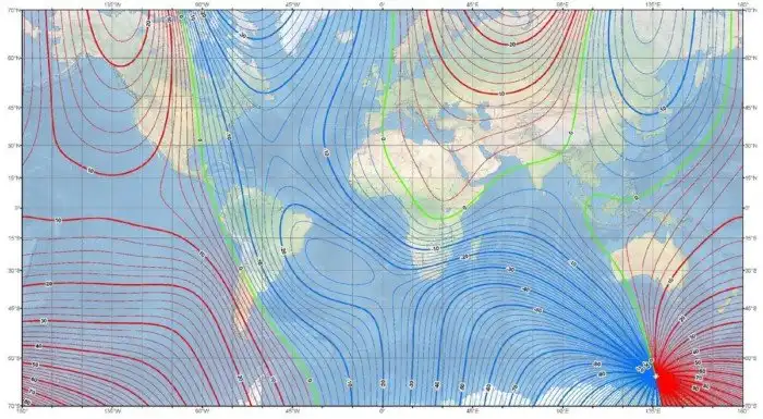 Наконец, уже в XX веке учёные выяснили, что магнитные полюса Земли – вовсе не неподвижные точки на поверхности! Магнитные полюса нашей планеты движутся, причём довольно-таки быстро, со скоростью порядка 40 километров в год. Если в те годы, когда родители купили автору этих строк самую первую географическую карту, северный магнитный полюс находился на территории арктической Канады, то сейчас он оттуда «уплыл» в нейтральные воды и движется через Северный Ледовитый океан в сторону России! Поэтому карта магнитных склонений также постоянно изменяется – сдвигаются магнитные полюса, а следом за ними движутся и линии магнитных склонений.