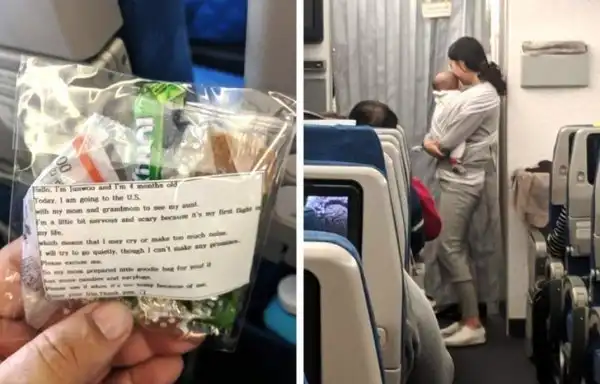 Надпись: "Привет! Я Джунву, мне 4 месяца. Я лечу в США с моей мамой и бабушкой к тете. Я немного нервничаю, так как это мой первый полет, поэтому я могу плакать и наводить много шума. Я постараюсь вести себя тише, но не обещаю. Пожалуйста, извините меня. Моя мама приготовила этот пакетик для вас — там конфеты и беруши. Воспользуйтесь ими, если я буду шуметь. Наслаждайтесь поездкой. Спасибо!"