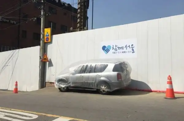 В месте, где проводятся ремонтные работы, рабочие надевают на стоящие неподалеку машины,специальные пакеты