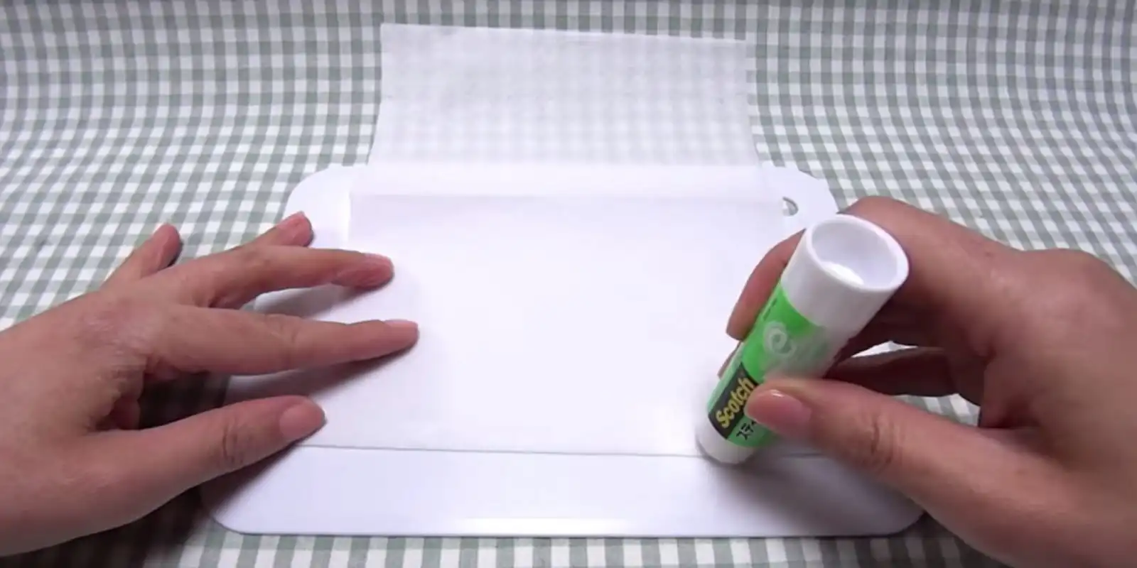 Переверните маску на обратную сторону, где нет лямок. Нанесите клей на один узкий край и загните его, прикрепляя бумагу.