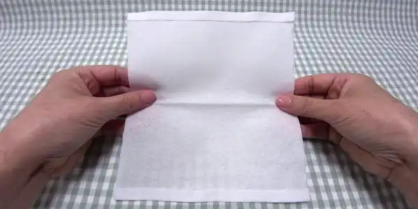 От полотенца отрежьте прямоугольник размером 20 х 16 см. Согните его поперёк пополам. Положите сгибом вверх и смажьте нижний узкий край клеем.