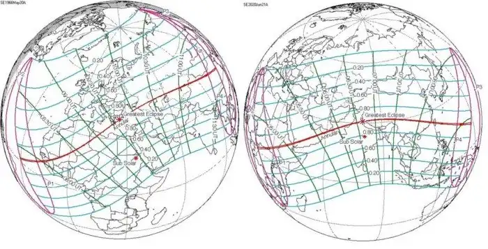 Слева: затмение 20 мая 1966 года. Справа: 21 июня 2020 года