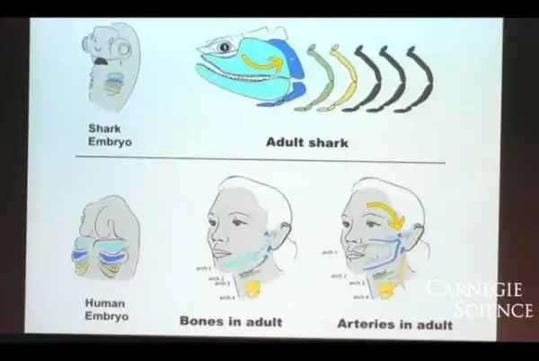 В своём доказательстве он сравнивает эмбрионы акулы и человека, которые на первый взгляд не выглядят такими уж разными. Далее он разными цветами обозначил части у обоих эмбирионов и показал, чем они становятся после развития.