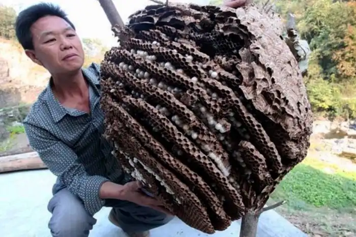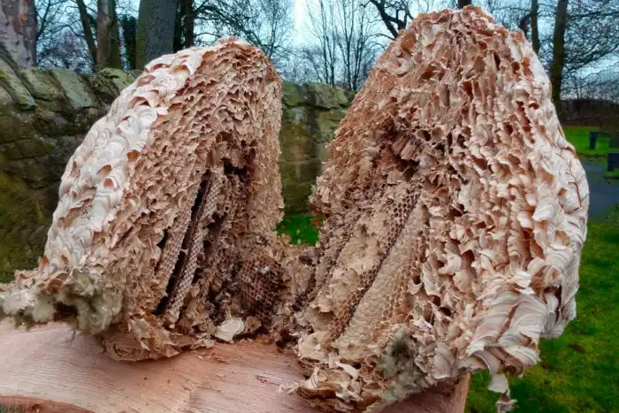 Если взять и разрезать осиное гнездо, то оно будет выглядеть как шар неправильной формы с многослойной оболочкой. Под ней скрывается довольно сложная структура. Почти всё пространство гнезда занимают личинки ос. Они находятся в шестиугольных сотах. В этом плане сильно напоминают улей пчёл.