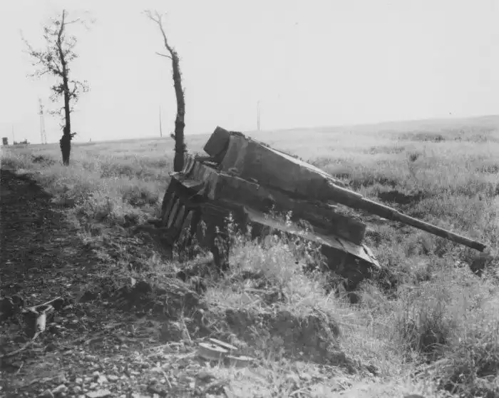 Подбитый и брошенный на обочине дороги немецкий танк Pz.Kpfw.VI «Тигр». Так же, как и у некоторых брошенных «Тигров», на стволе данного танка отсутствует дульный тормоз. А также оторвана «с мясом» командирская башенка.