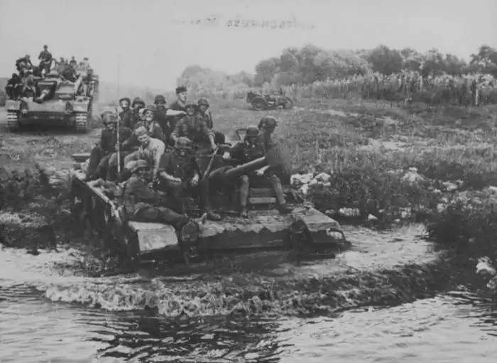 Немецкое штурмовое орудие StuG III (Sturmgeschütz III) с пехотой на броне форсирует речушку под Ростовом-на-Дону. Дульный тормоз САУ на переднем плане заретуширован. А что такого в этом тормозе, раз его замазали, а другой нет?