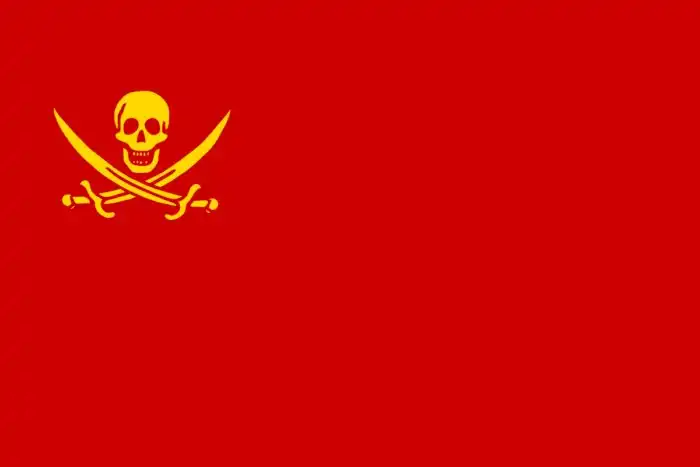 Государственным флагом стало черное пиратское полотнище, как полагается, с черепом под косой, скрещенной с копьем. Девиз: "Смерть буржуям!".