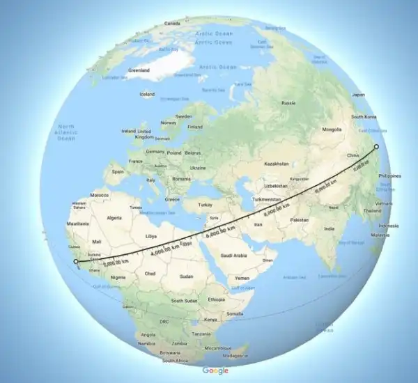 5. Это линия между Ливией и Китаем. Длина - 13500 километров по прямой. На этом пути не встречается ни одной существенной водной преграды.