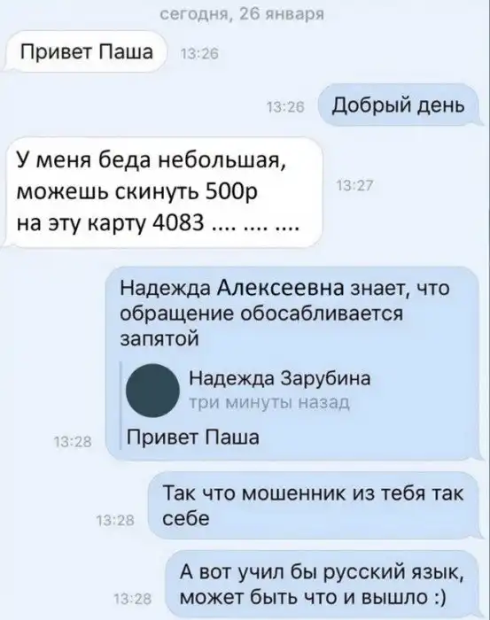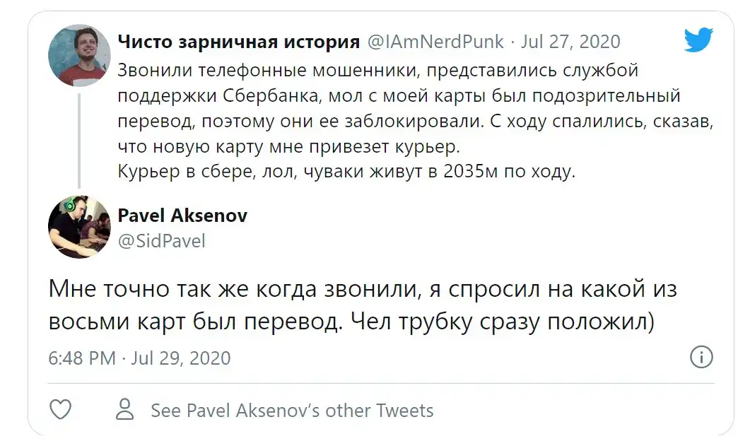 В век мессенджеров и зума звонить по телефону незнакомому человеку уже почти дурной тон. Звонок, ранее не согласованный с собеседником в соцсетях или по почте, заставляет владельца телефона насторожиться и заволноваться, особенно если у него включён звук на телефоне. В 2020 году настойчиво звонят в основном для того, чтобы что-то впарить или что-то украсть. В век мессенджеров и зума звонить по телефону незнакомому человеку уже почти дурной тон. Звонок, ранее не согласованный с собеседником в соцсетях или по почте, заставляет владельца телефона насторожиться и заволноваться, особенно если у него включён звук на телефоне. В 2020 году настойчиво звонят в основном для того, чтобы что-то впарить или что-то украсть. Так как всякие банки и сайты не очень-то следят за сохранностью оставленных им личных данных, ваш номер телефона может оказаться как у фирмы, очень навязчиво продающей пылесосы, так и у сидельца, изучившего на досуге скрипт сотрудника колл-центра банка. И не только номер телефона, но и адрес, паспортные данные и информация о состоянии банковского счёта. Такой большой набор данных даёт мошенникам простор для творчества.