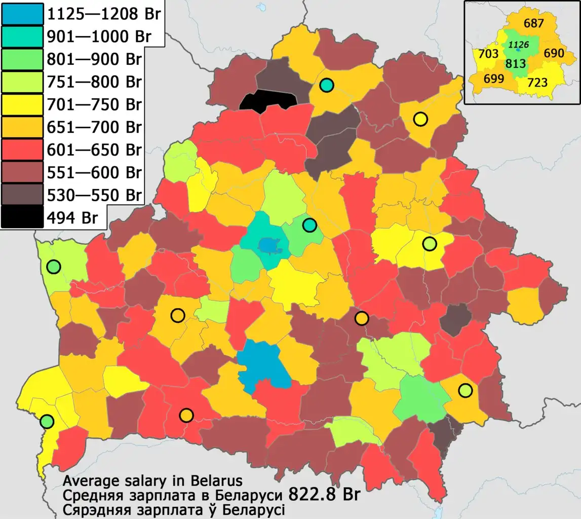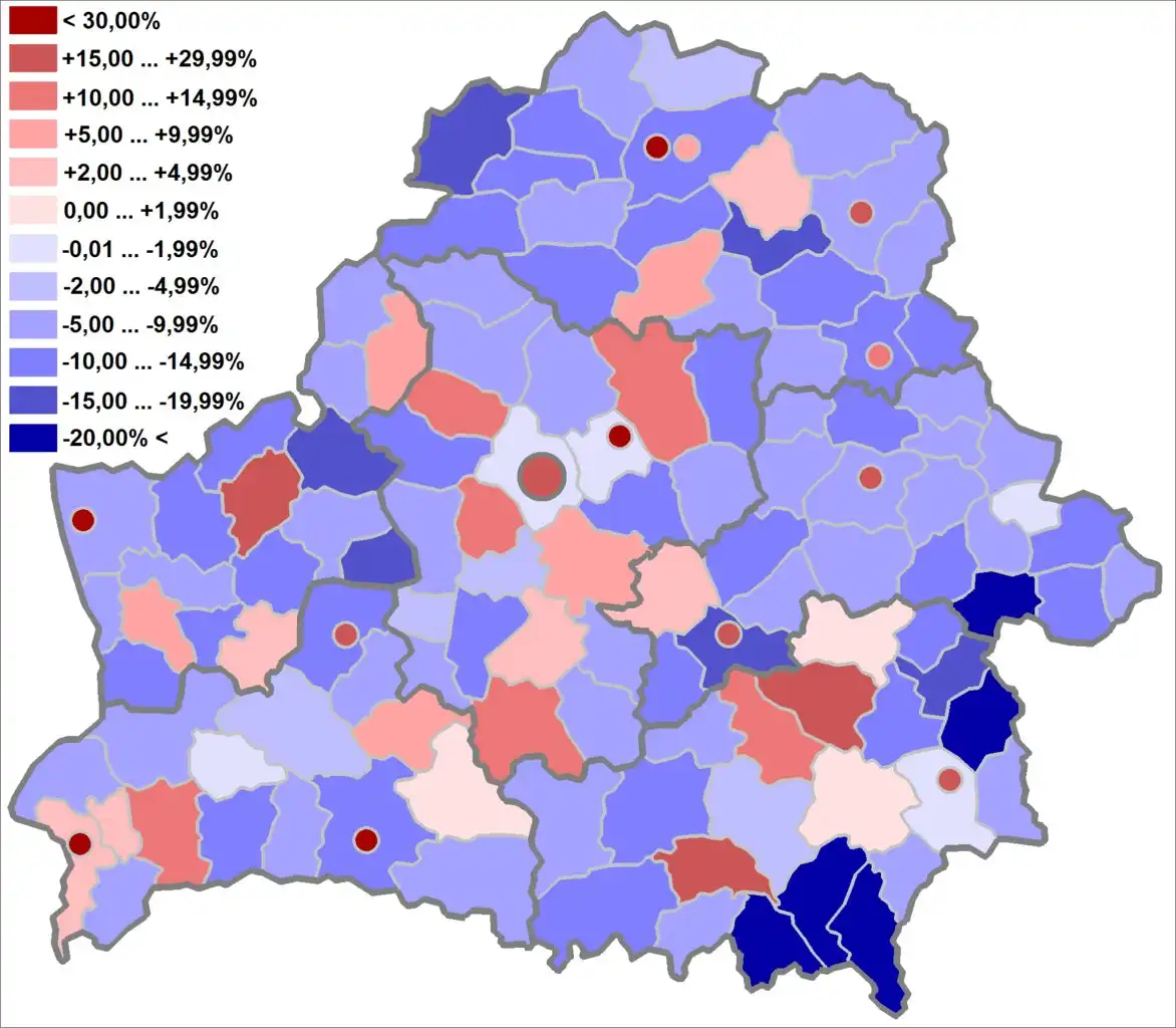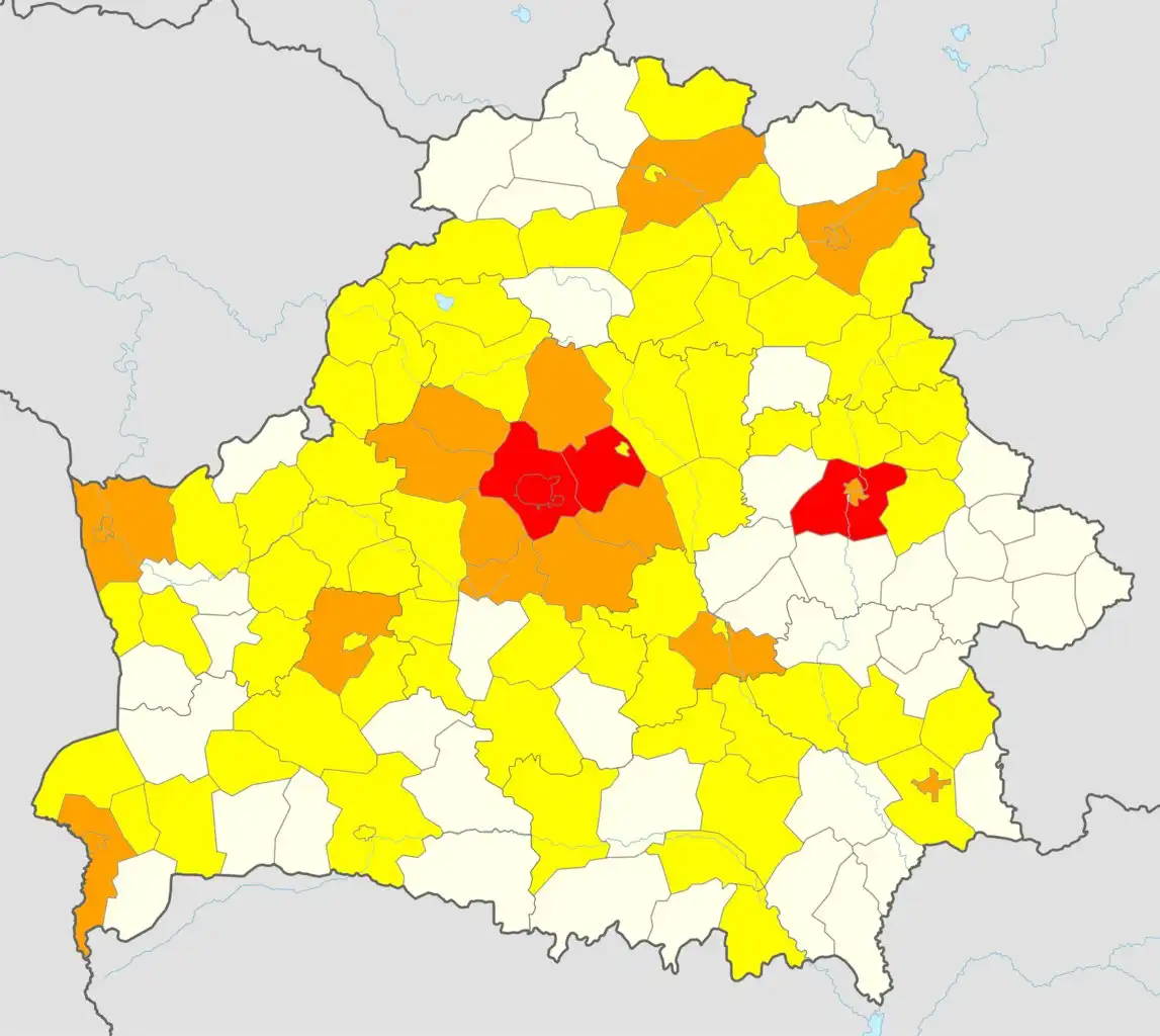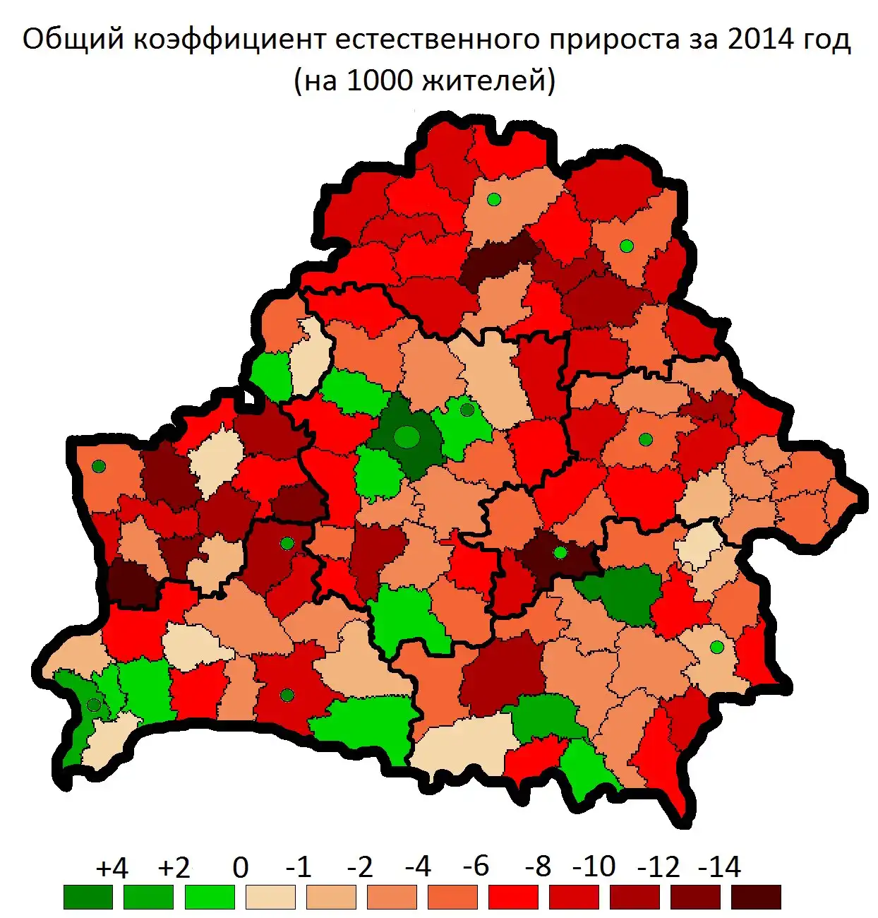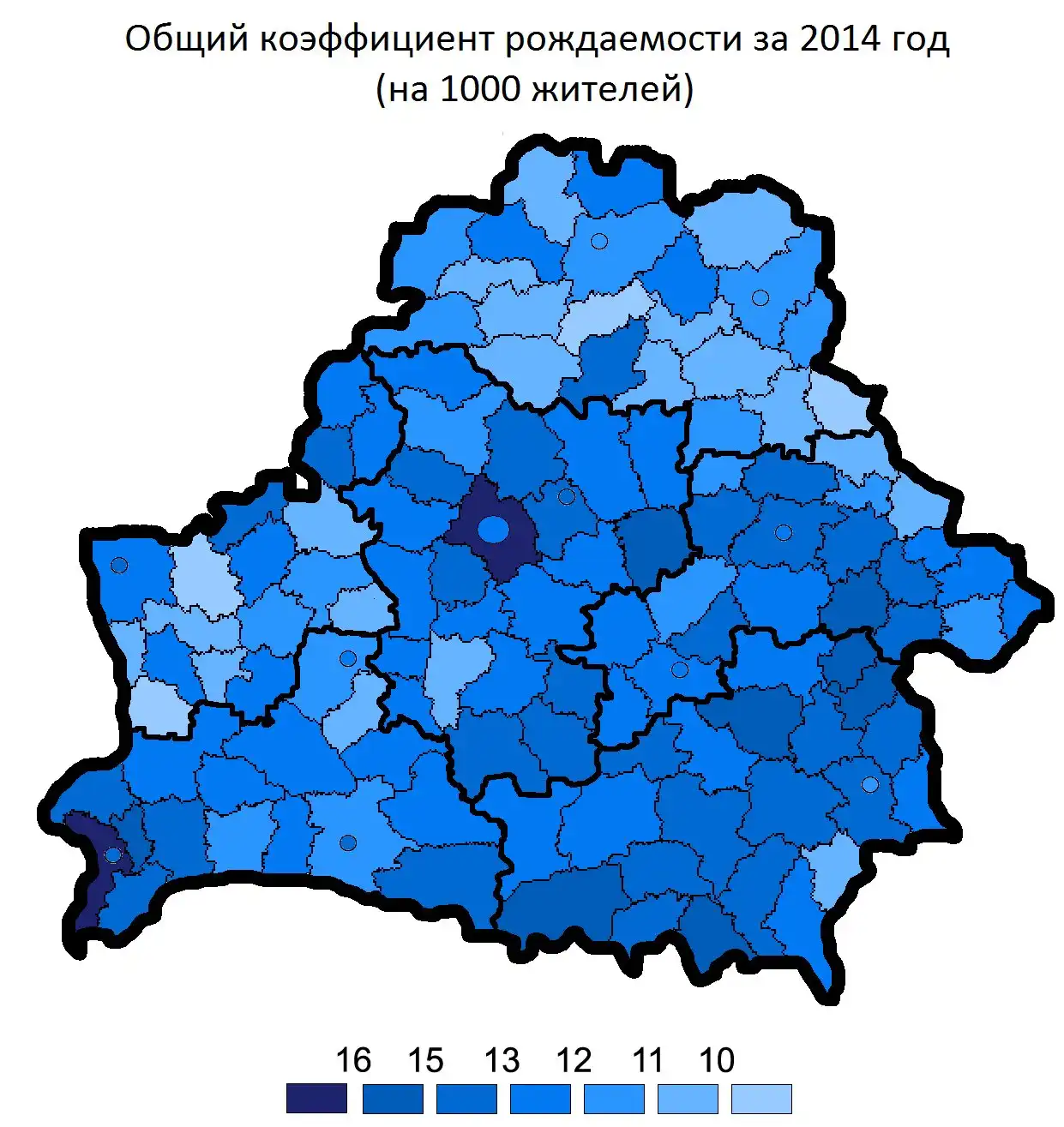 Плотность населения Белоруссии по муниципальным образованиям на 2016 год.