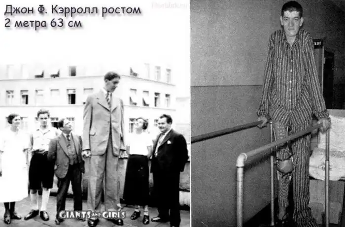 Американец Джон Кэрролл в детстве ничем не отличался от своих сверстников. Его рост небывалыми темпами начал увеличиваться в возрасте 16 лет. Практически сразу начались проблемы со спиной и суставами. Нагрузка на позвоночник привела к его искривлению, парню стало тяжело передвигаться. Джон неоднократно проходил курсы лечения, но они не давали желаемых результатов. Умер мужчина в возрасте 36 лет.