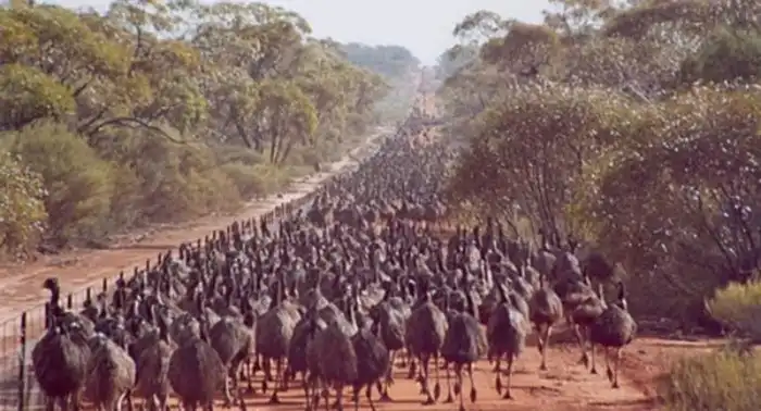 В 1932 году около 20 тысяч эму атаковали сельскохозяйственные угодья фермеров в Западной Австралии. Они ломали ограждения, проникали на поля и опустошали посевы пшеницы. Попытки фермеров справиться с нашествием зверей своими силами не увенчались успехом.