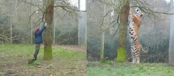 Сибирский тигр и человек рядом с одним и тем же деревом