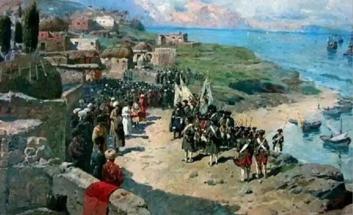 7 июля 1770 года эта эскадра сожгла в Чесменской бухте турецкий флот. Турки попросту не ожидали нападения русских с моря; восстали многие покоренные турками народы; осенью 1773 года русские десантники сумели даже захватить Бейрут. В общем, великая Османская империя затрещала по швам, как плохо пошитый халат. Под конец войны совсем молодой тогда 44-летний генерал-поручик Александр Суворов нанес туркам еще одно поражение в битве при Козлуджи. 21 июля 1774 года Румянцев заставил турок подписать в Кючук-Кайнарджи (по-турецки «горячий источник») унизительный мир, превращавший Крымское ханство в фактического данника России.