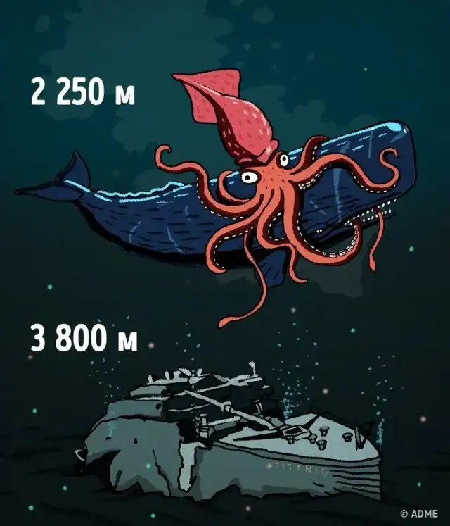 1 000 метров. Свет с поверхности не может достичь этой точки, поэтому ниже — кромешная тьма. Давление тут такое же, как если бы вы стояли на поверхности Венеры (то есть нас бы раздавило очень быстро). Тут также начинается зона обитания гигантских кальмаров.