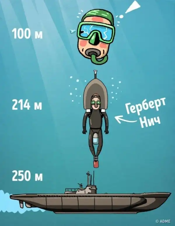 214 метров. Но угроза жизни не остановила человека по имени Герберт Нич (Herbert Nitsch), который установил рекорд, погрузившись на 214 метров в воду, причем нырнул он на такую глубину без акваланга. К его ногам и голове были привязаны грузы, чтобы погружение получилось достаточно быстрым.