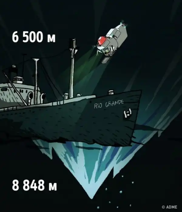 6 762 метра. Тут покоится SS Rio Grande — корабль, затонувший во время Второй мировой войны. Считается самым глубоко расположенным затонувшим судном в мире.
