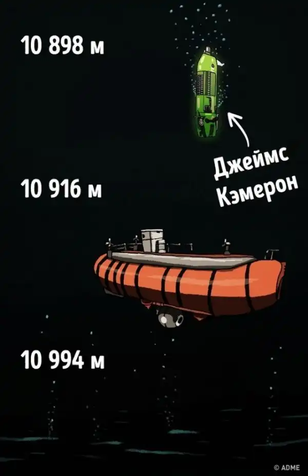 10 898 метров. Глубина, на которую погружался режиссер Джеймс Кэмерон в 2012 году. Погружение заняло 3 часа, в течение которых режиссер наблюдал за окружающим его миром кромешной темноты и вел сьемку в 3D, чтобы включить полученные кадры в научно-популярный фильм «Вызов бездне 3D» (Deepsea Challenge 3D). Кэмерон стал третьим человеком, рискнувшим опуститься на 11-километровую глубину, и первым, кто сделал это в одиночку.