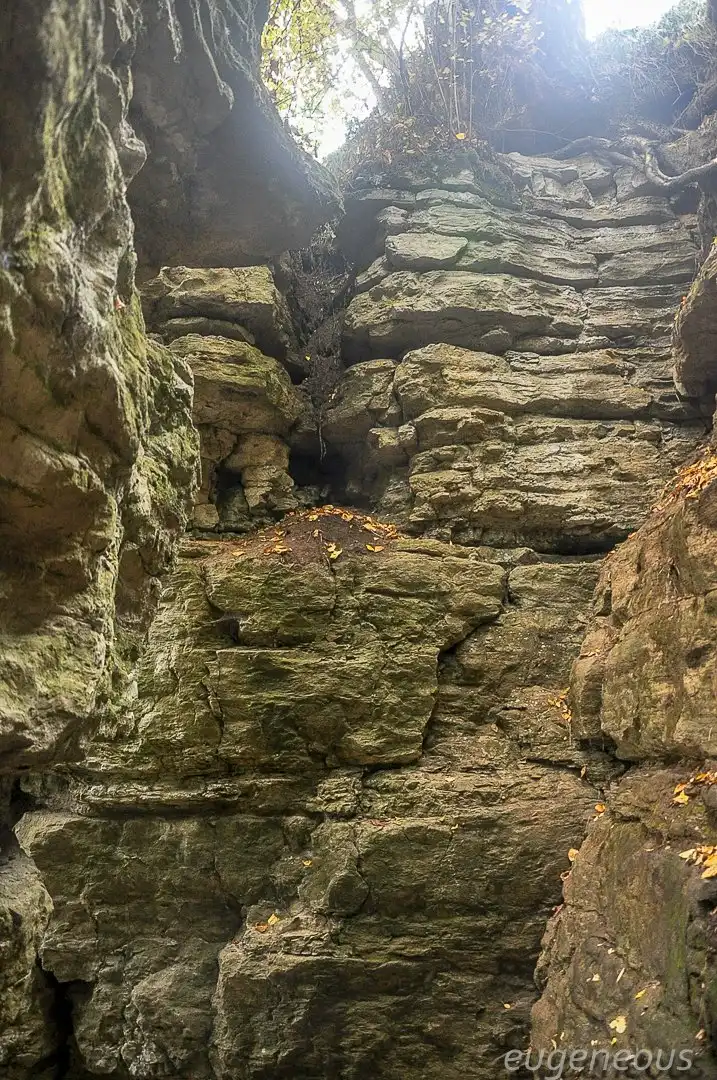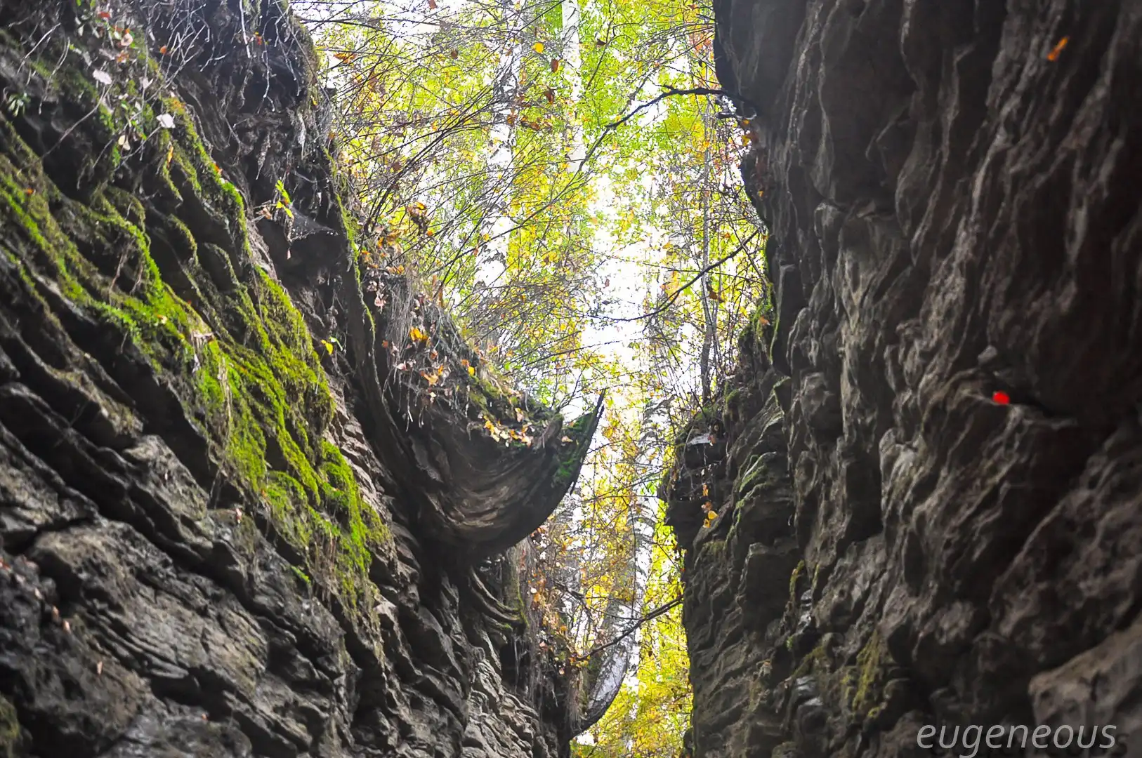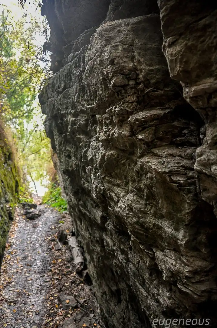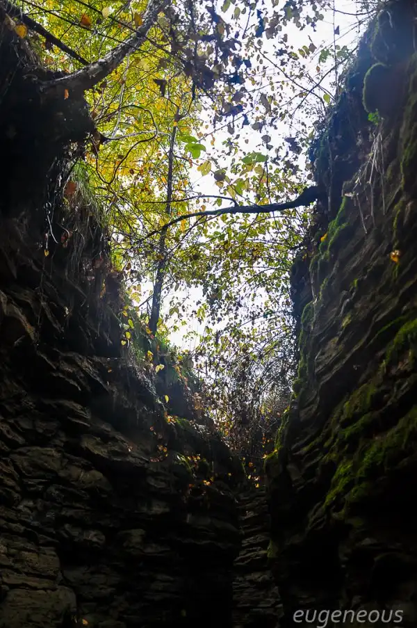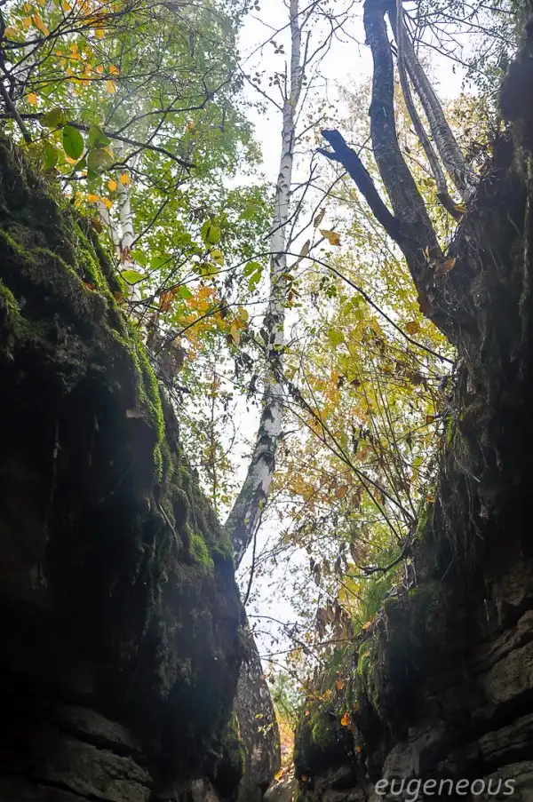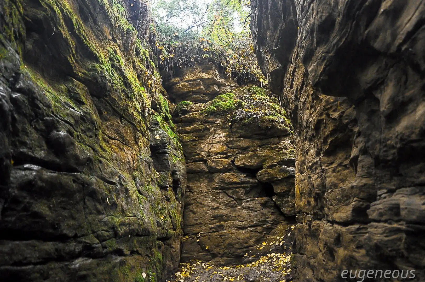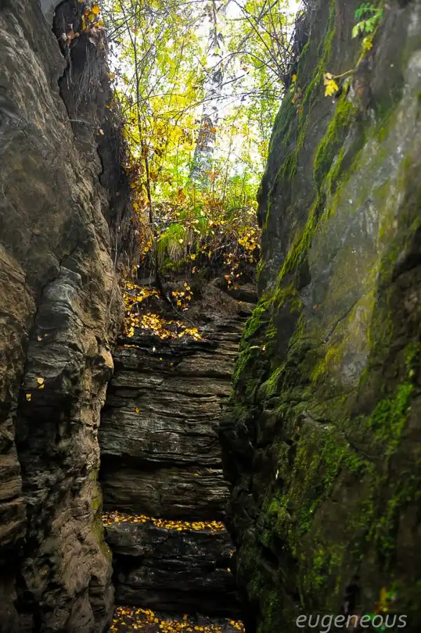 Высота стен разлома около 7 метров. Стены из мягкой породы типа песчаник. Замшелые, сырые и холодные.