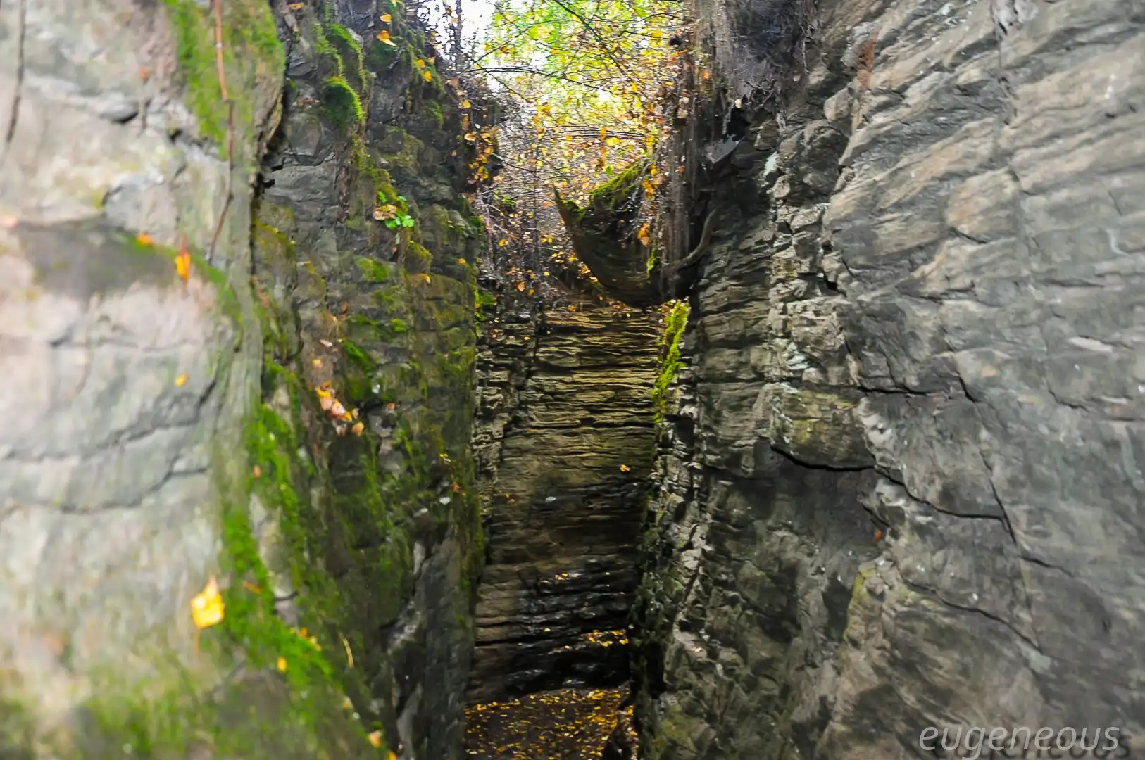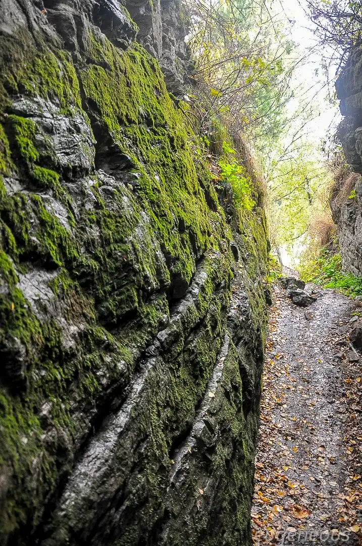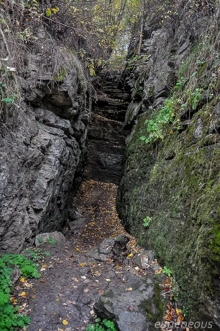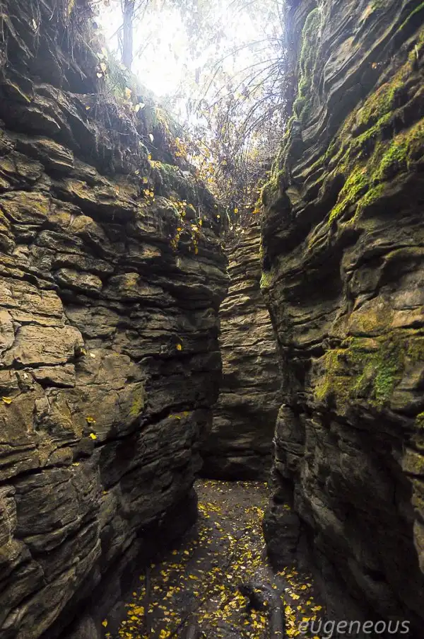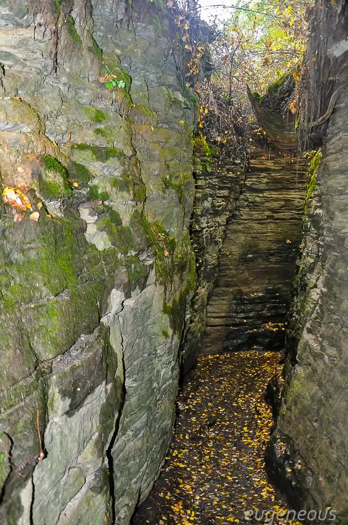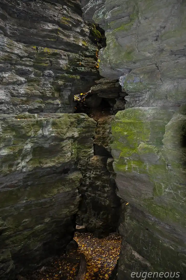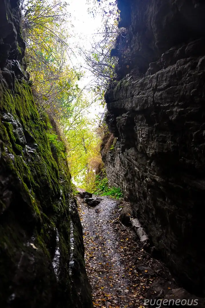 Высота стен разлома около 7 метров. Стены из мягкой породы типа песчаник. Замшелые, сырые и холодные.
