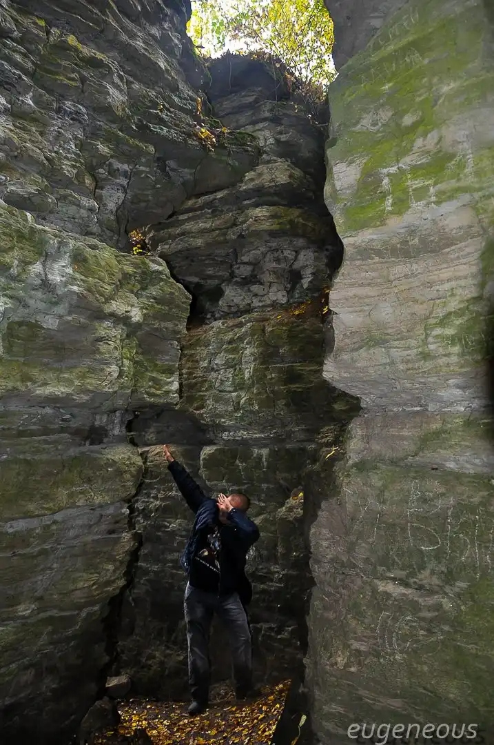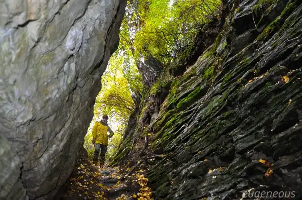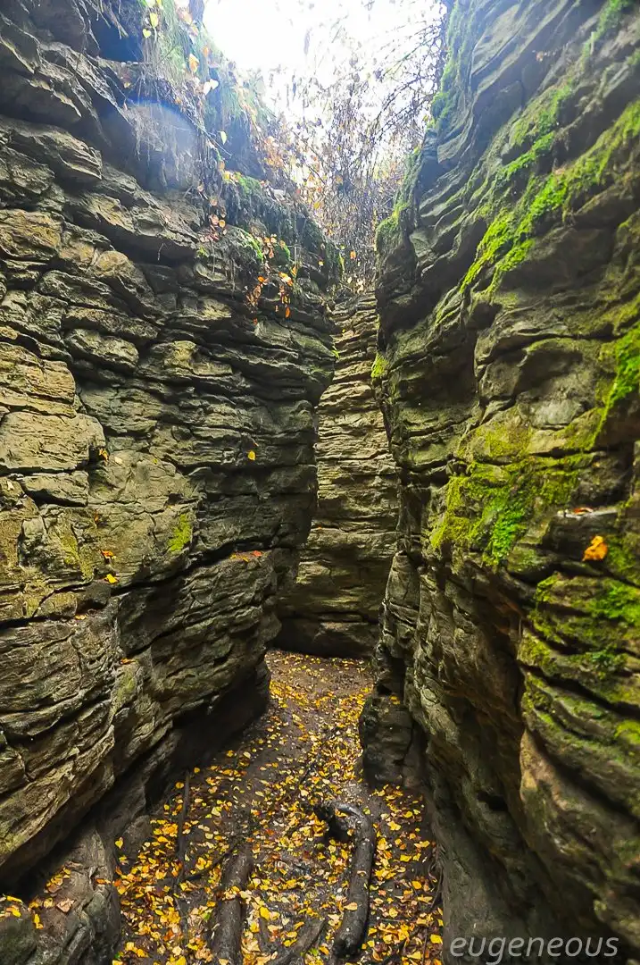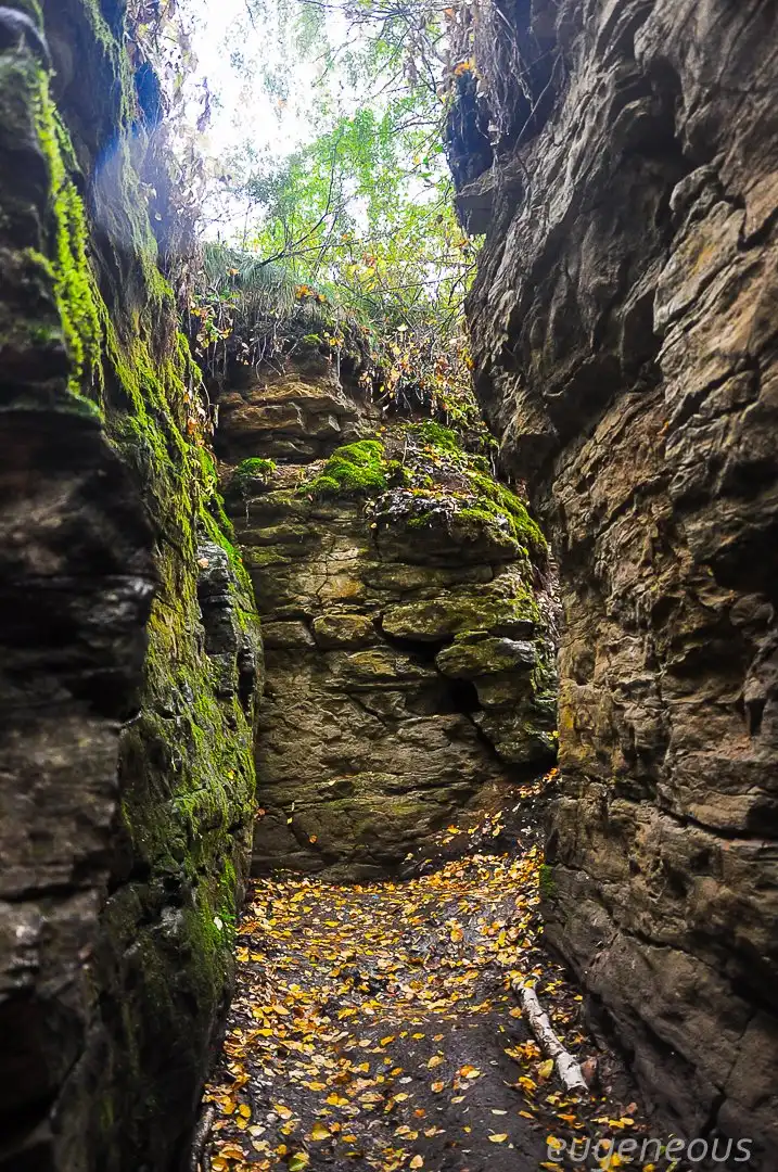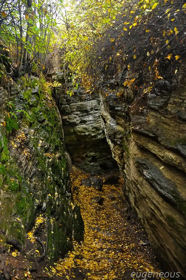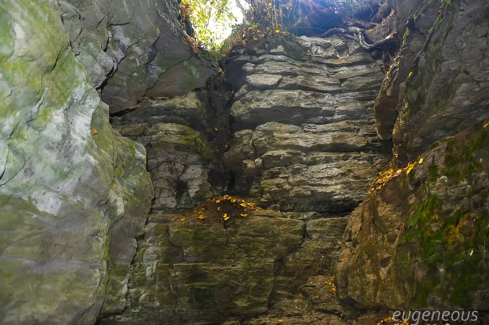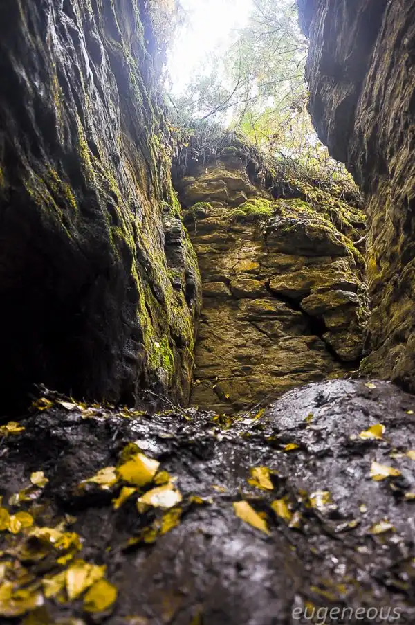 Высота стен разлома около 7 метров. Стены из мягкой породы типа песчаник. Замшелые, сырые и холодные.