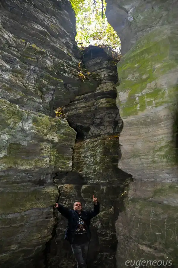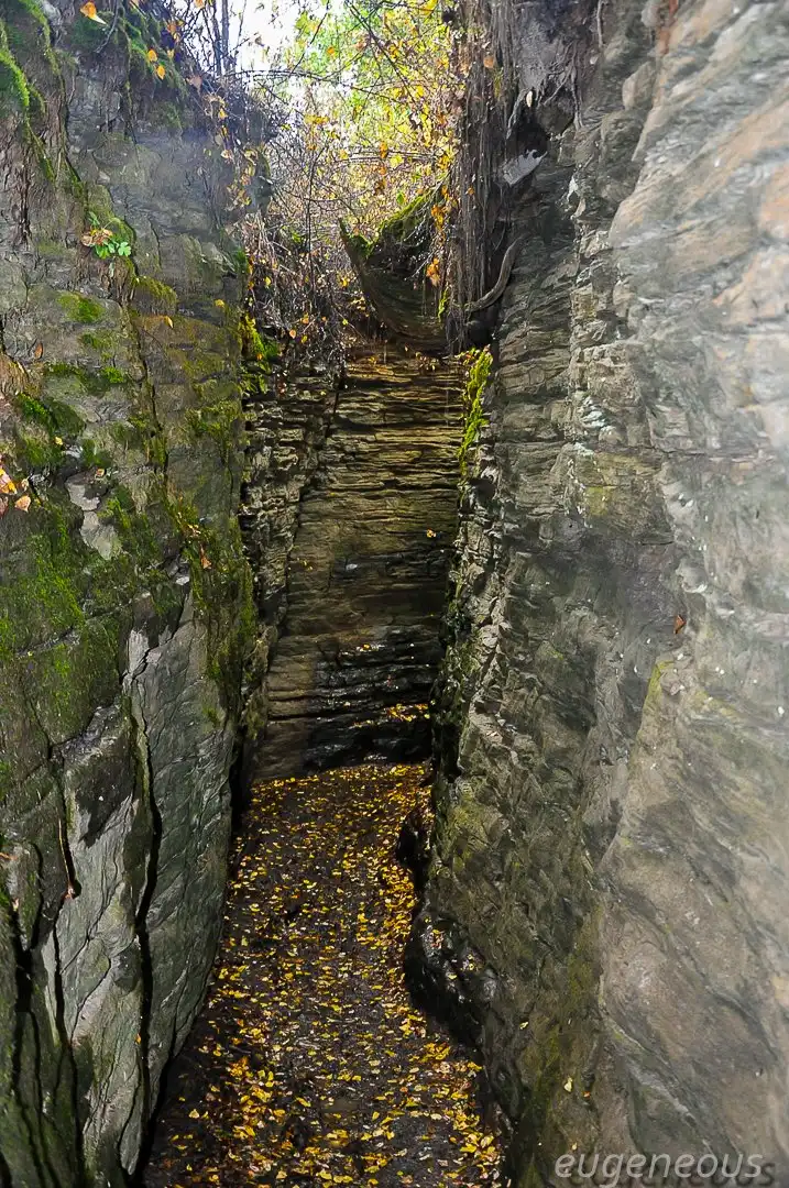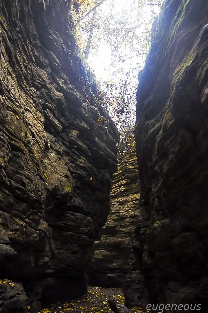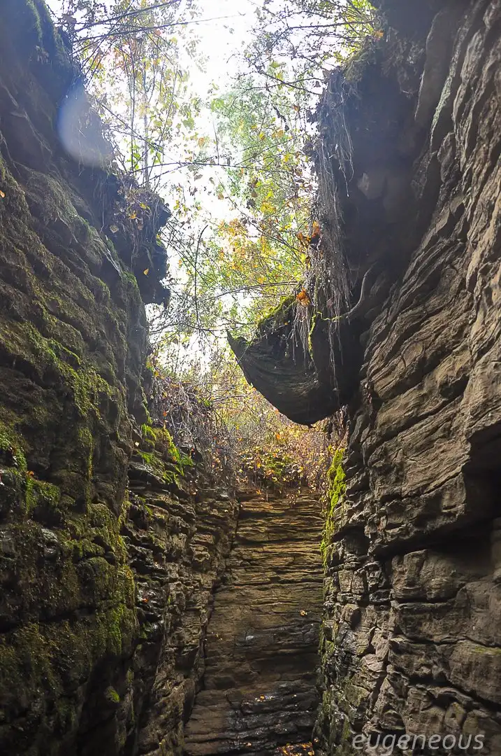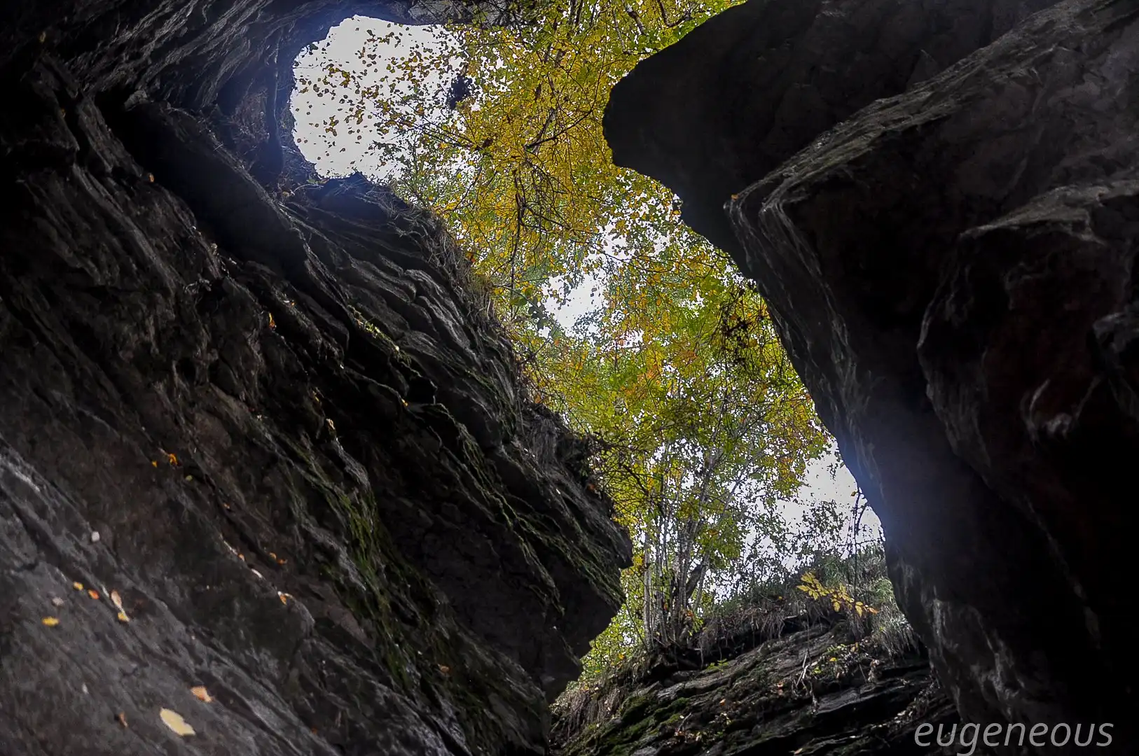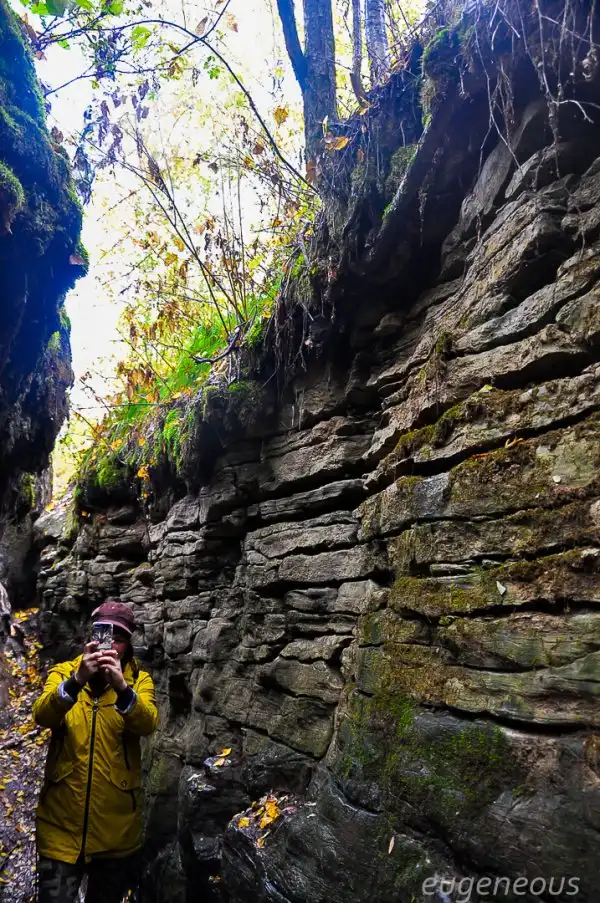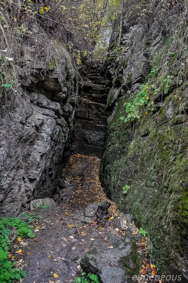 Высота стен разлома около 7 метров. Стены из мягкой породы типа песчаник. Замшелые, сырые и холодные.