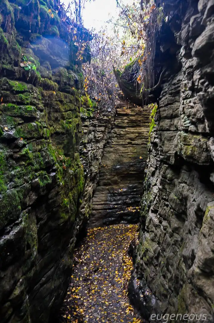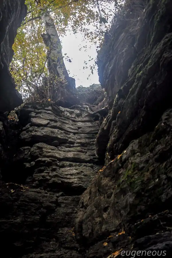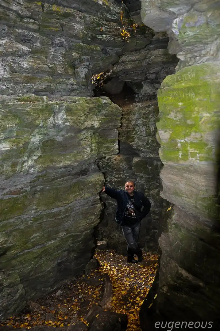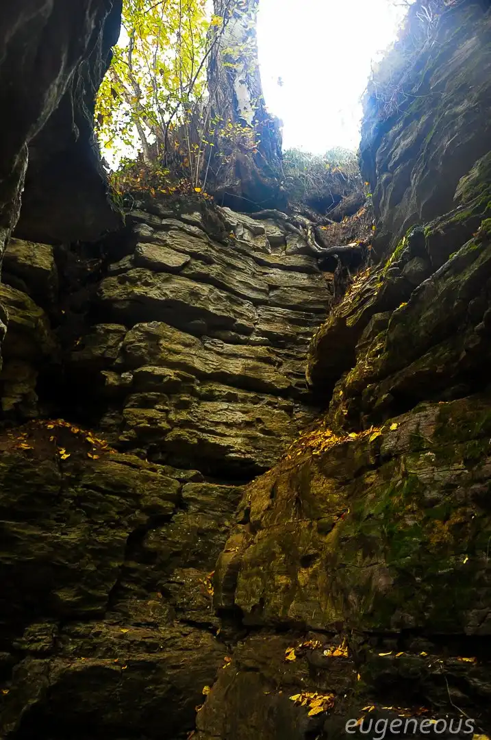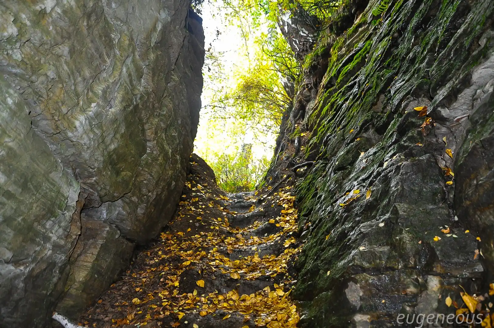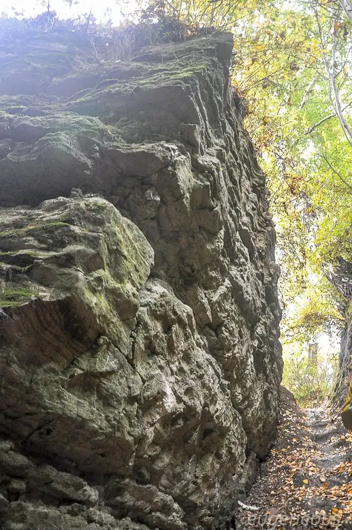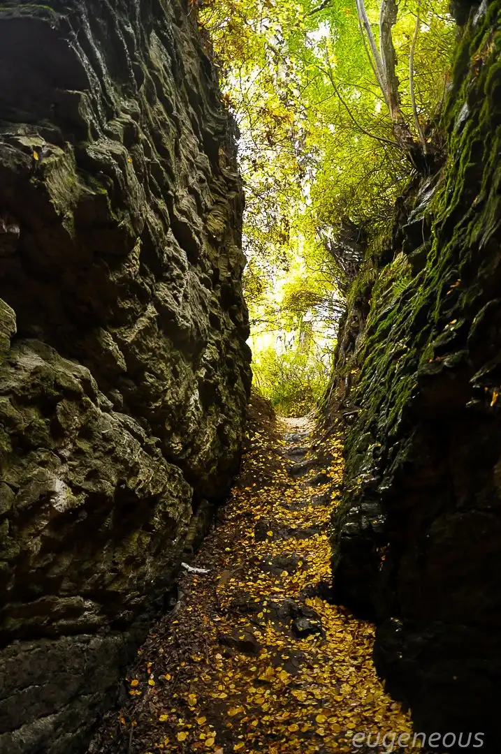 Высота стен разлома около 7 метров. Стены из мягкой породы типа песчаник. Замшелые, сырые и холодные.