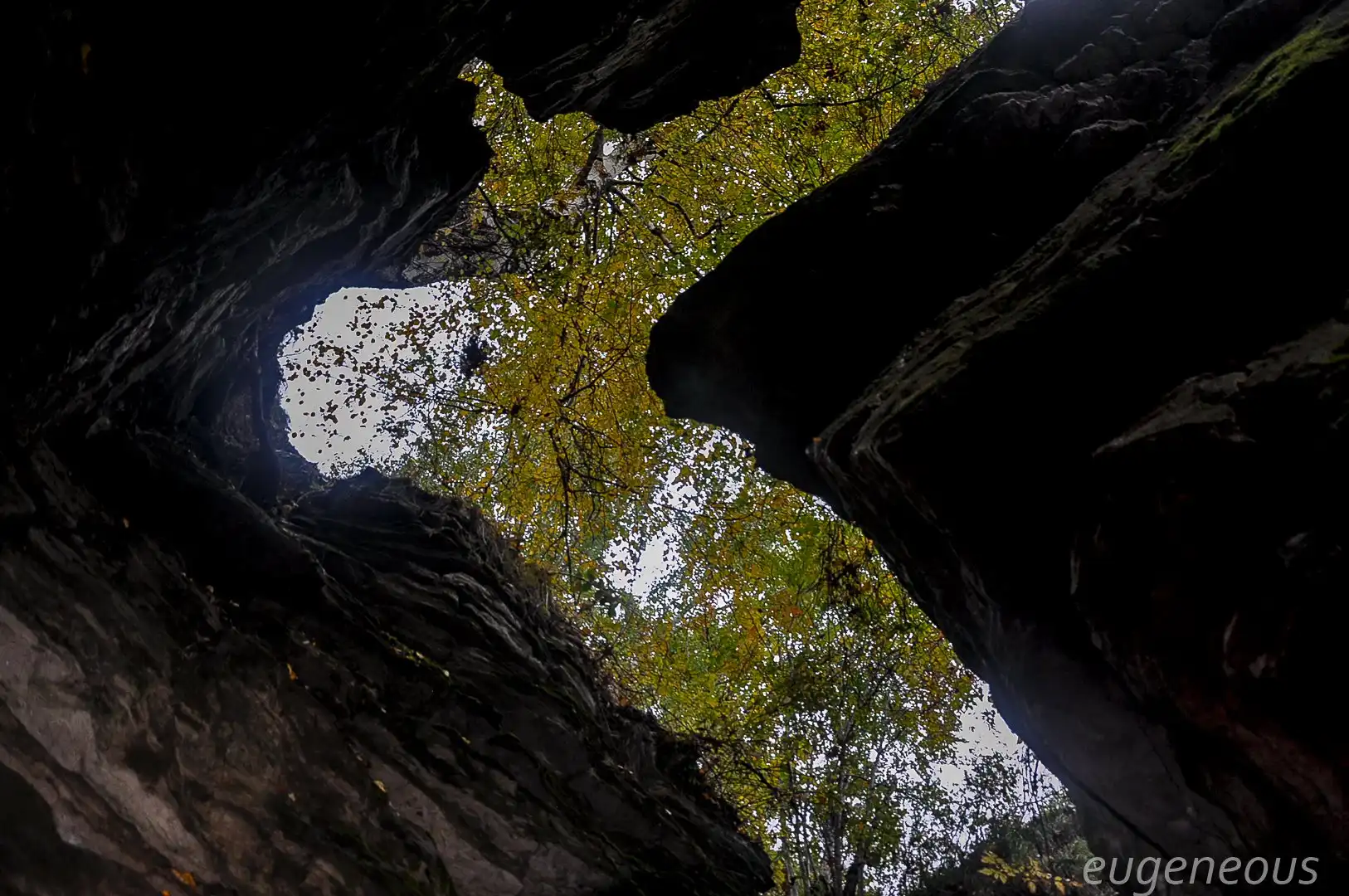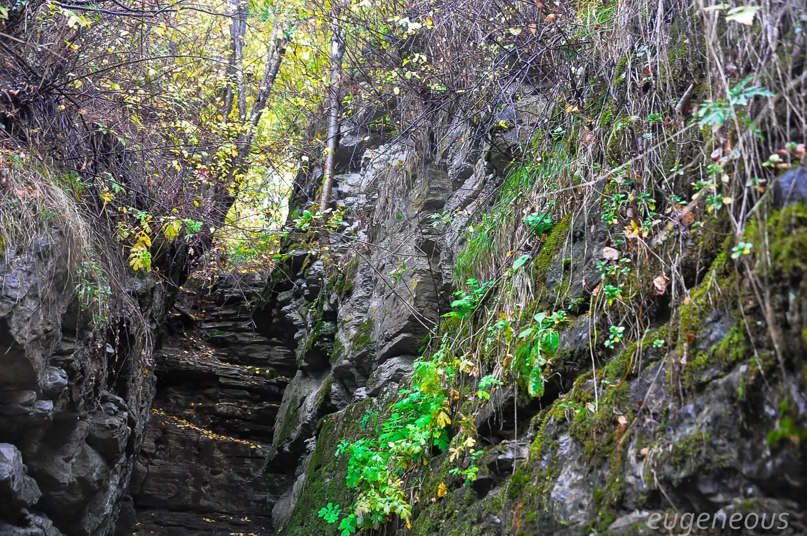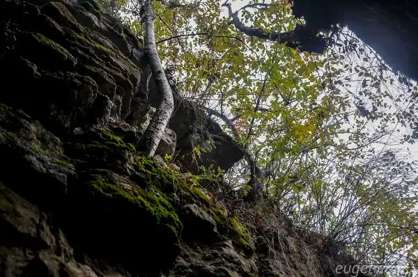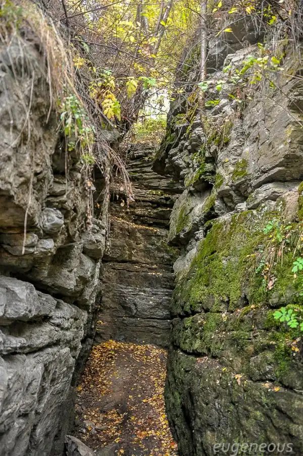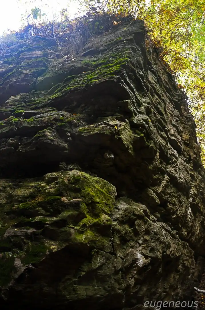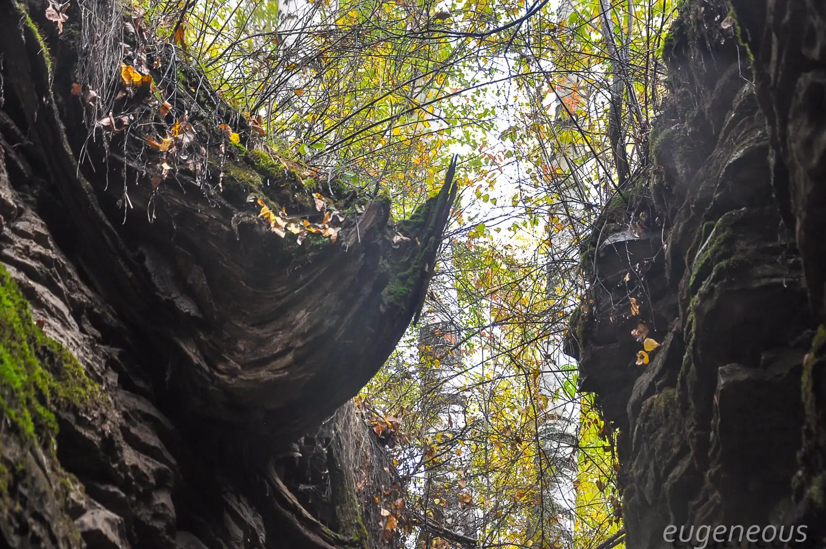 Высота стен разлома около 7 метров. Стены из мягкой породы типа песчаник. Замшелые, сырые и холодные.