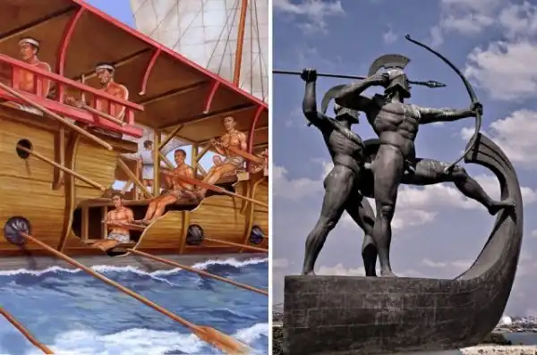 Размещение гребцов на древнегреческой триреме и полюбившийся местной пернатой фауне памятник, воздвигнутый современными греками на берегу Саламинского пролива.