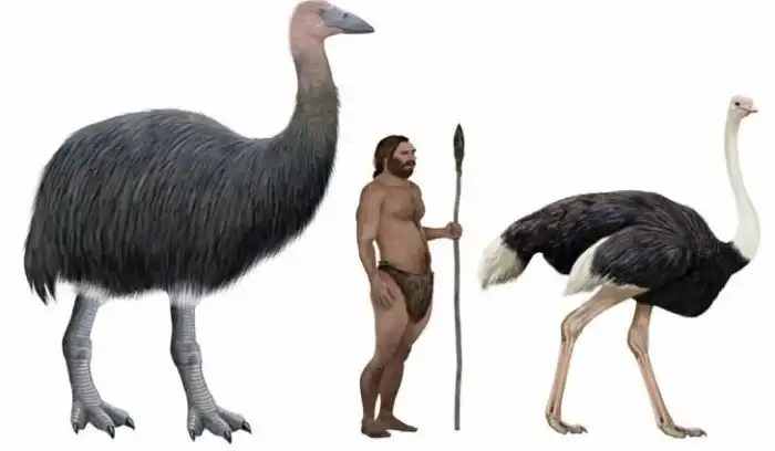 Ископаемая мадагаскарская птица-слон (Aepyornis Mullerornis) в сравнении с человеком и африканским страусом