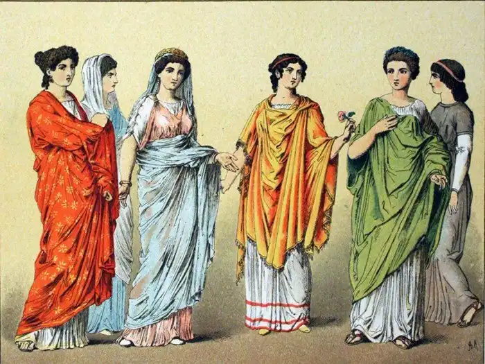 Похожую на тогу шерстяную столу носили поверх туники. Следующим слоем шла палла, которая в случае необходимости набрасывалась на голову, превращаясь в платок. Все эти одеяния, как правило, имели яркую расцветку. Они могли быть как однотонными, так и многоцветными. Некоторые оттенки, например, фиолетовый, отличались чрезвычайной дороговизной и были по карману лишь самым обеспеченным римлянкам.