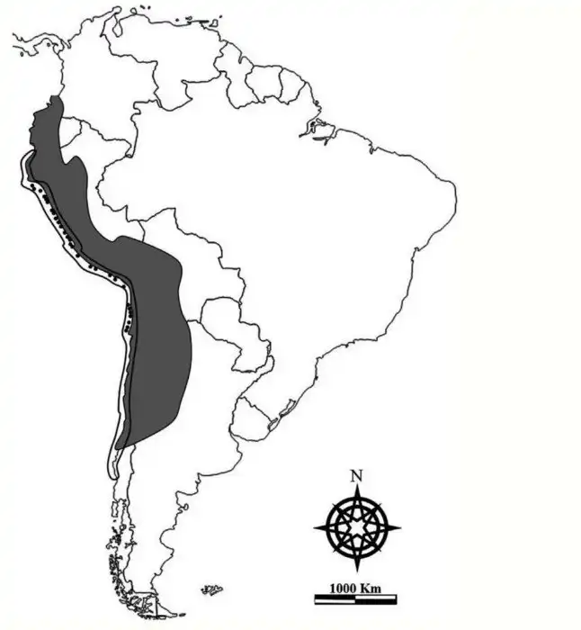 Империя инков (серая) и основные месторождения гуано вдоль западного побережья Южной Америки (отмечены черными точками).
