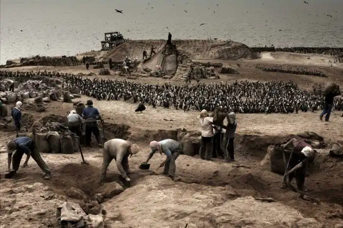 Рабочие собирают гуано с земли и складывают его в большие мешки на Макаби, острове у побережья Перу. Сзади гуанайские бакланы и перуанские пеликаны (с) Эрнесто Бенавидес