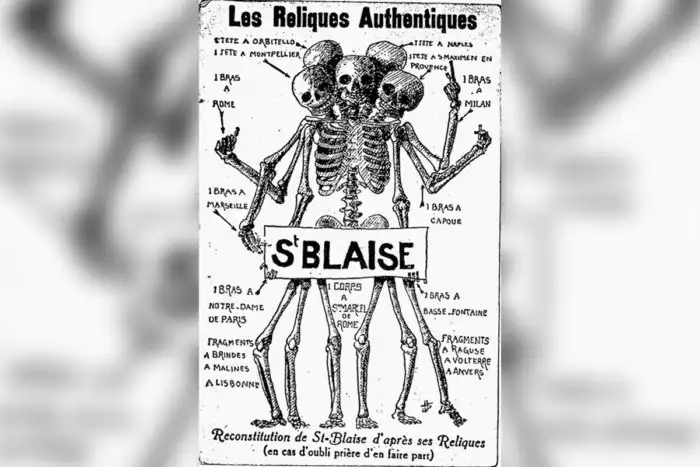 Французская открытка конца 19 – начала 20 века, наглядная критика почитания мощей. На одном изображении помещены все части мощей Власия, которые находятся в разных городах.
