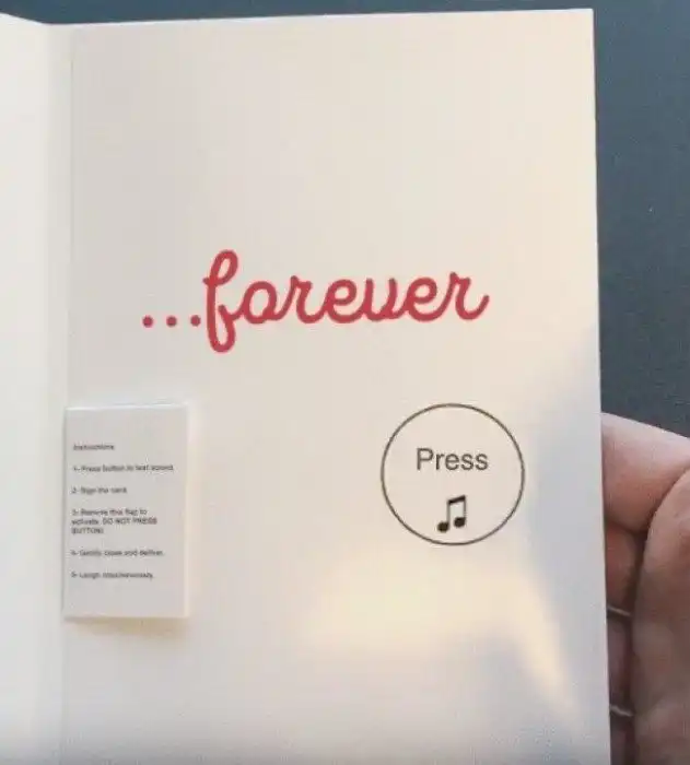 На первый взгляд, эта открытка с фразой "навсегда" ничем не отличается от других музыкальных картинок. Однако музыка никогда не перестает звучать: ни когда открытку закрывают, ни после того, как она три часа пролежит в воде. Музыка может замолчать, только после физического уничтожения открытки. Потребителям идея понравилась : создатель получил 92 000 долларов, в то время как он надеялся только на 7500.