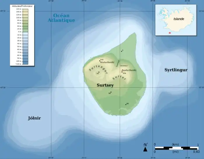 К 24 ноября новорождённый остров достиг поперечника в километр. Извержение не прекращалось, постоянно были слышны взрывы. Раскалённые вулканические бомбы разлетались вокруг в радиусе 500 метров, и всё небо было затянуто плотными облаками пепла. Новый остров назвали «Сюртсей» – в честь грозного ётуна (великана) Сюрта из скандинавских легенд. 6 декабря трое отважных журналистов французского журнала «Пари матч» высадились на берег островка, пробыли там около 15 минут и чуть не погибли. Извержение вулкана продолжалось несколько лет – оно полностью затихло только в июне 1967 года.