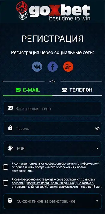 К регистрации в казино допускаются только совершеннолетние игроки. Чтобы создать игровой аккаунт в ГоксБет, понадобится 1 минута: