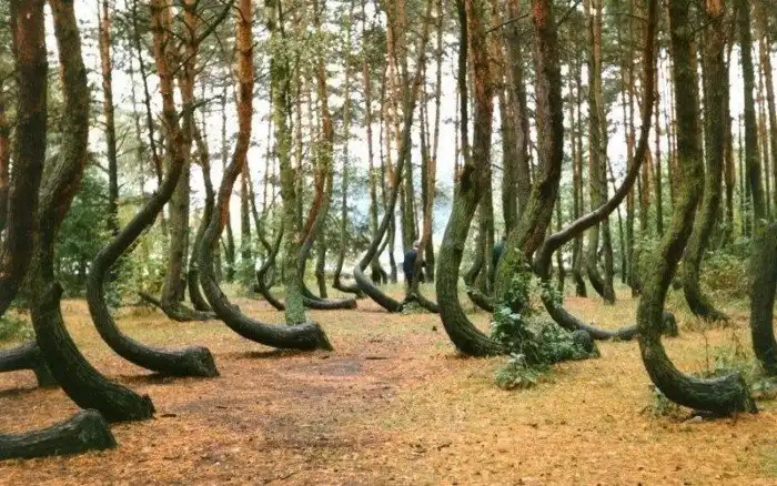 Эти деревья, в польском местечке Грыфино, выглядят как заколдованный лес. Они были посажены в 1930 году. Около четырехсот сосен выросли со странным изгибом на север. И до сих пор для всех остается загадкой, почему это произошло.